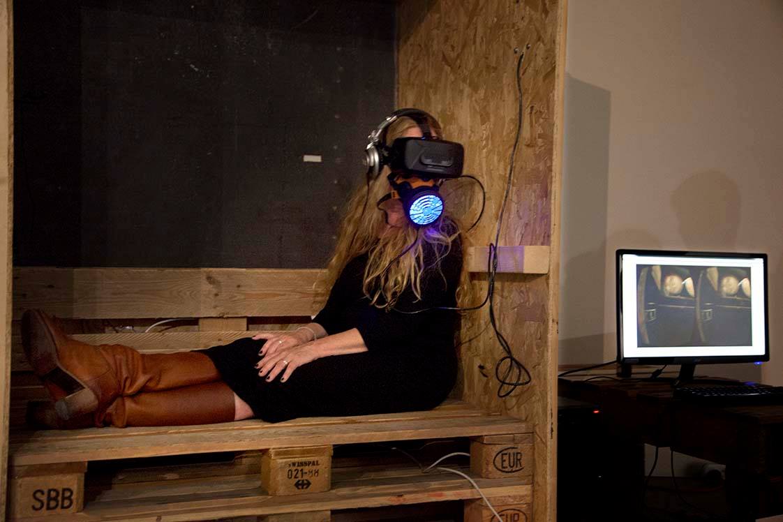 On a related note, another speaker, Cas Ketel, demoed his virtual reality installation A Breathtaking Journey. The installation places you in the role of a Syrian refugee stuffed in a box aboard a truck outbound from Syria. There is a tiny slit you can peek through. A sensor-modified paint mask measures your inhalation/exhalation, which enables it to check whether you’re making noise once guards show up. On top of that, you’re in an actual box, which does much to solve the experiential disconnect most of us have when donning the Rift or one of its compatriots. Recommended.