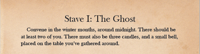You Will Be Haunted By Three Spirits lifts the confessional element from the story, and uses its three-ghost structure to have the players formally speculate about the life, sins and virtues of characters either real or imagined in an appropriately spooky environment. This way, it may turn to gossip, or preferably, a genuine discussion about morals, and the changeability of a person.