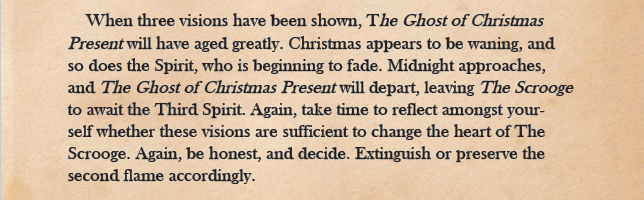 You Will Be Haunted By Three Spirits lifts the confessional element from the story, and uses its three-ghost structure to have the players formally speculate about the life, sins and virtues of characters either real or imagined in an appropriately spooky environment. This way, it may turn to gossip, or preferably, a genuine discussion about morals, and the changeability of a person.