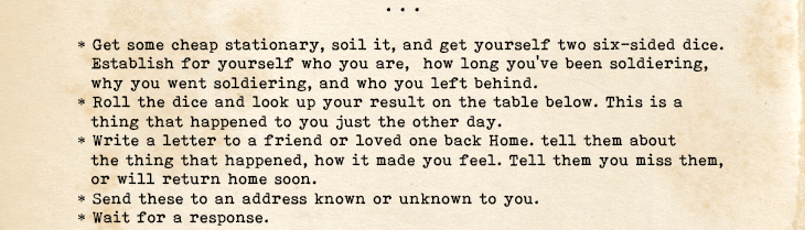 Released in 2019, Letters from the Trench is an epistolary roleplaying game inspired by the 200 Word RPG Challenge, a wonderful exercise in economy and elegance. The object of the game, if indeed it can be called that, is to write letters to other people from the battlefront you are stationed. Dice rolls determine things that have happened to you over the past few days – it is up to you to actually compose a letter and send it to a flesh-and-blood loved one, urging them to write you back. If you receive no reply (by letter) within ten days, you will die. If you do, you must continue rolling and writing – correspondence with home is the only thing keeping you alive.